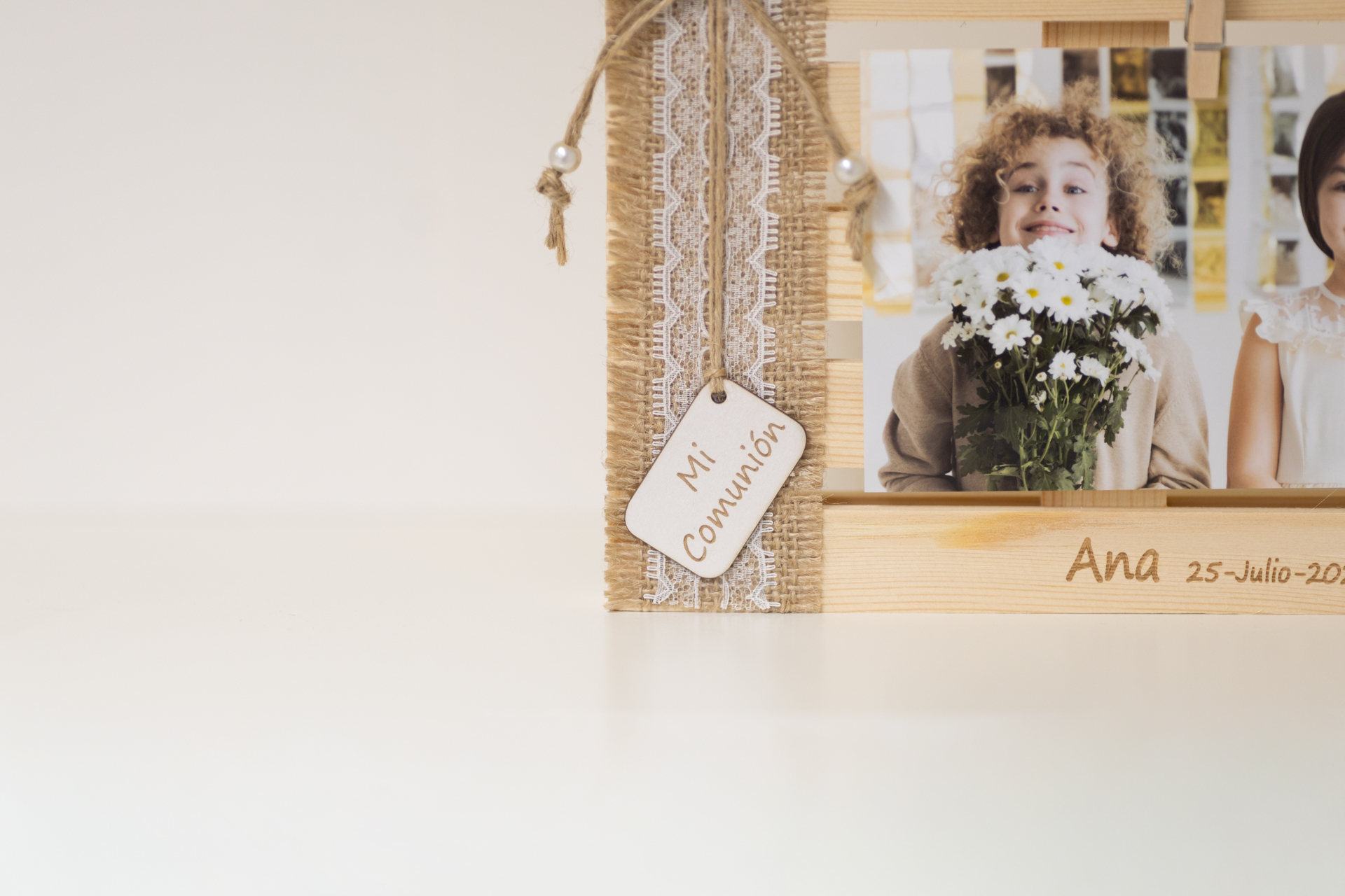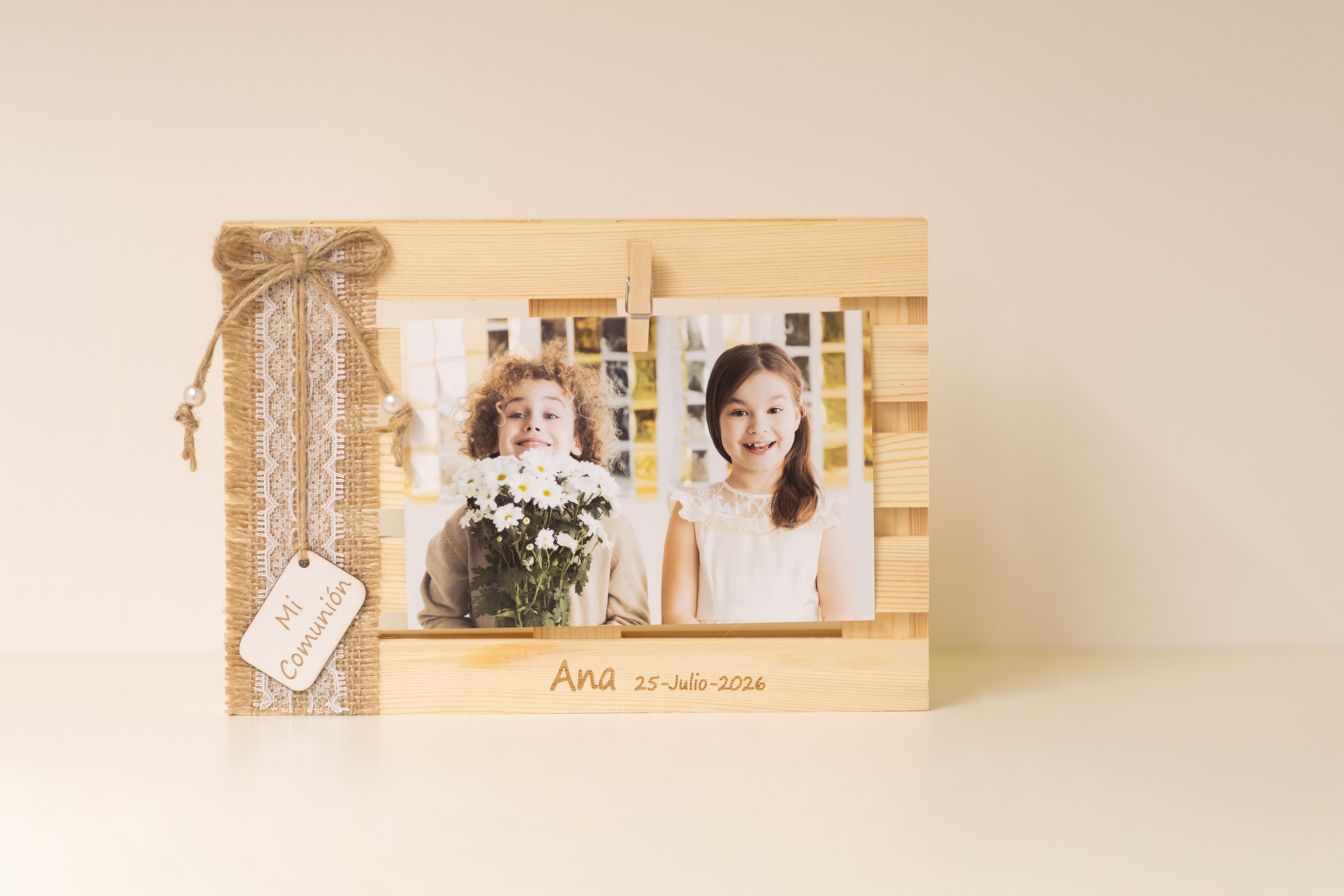 Confeccionado con cuidado y atención al detalle, este marco es el regalo perfecto para padrinos, abuelos o para el propio comunicante, creando un recuerdo tangible que podrá atesorarse por generaciones. Su diseño permite versatilidad en el tamaño de la foto y la opción de un grabado personalizado lo convierte en una pieza única e irrepetible.