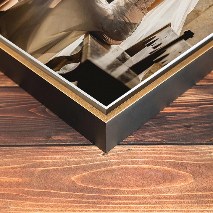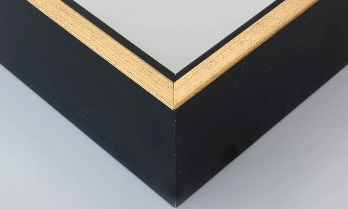 El Marco Fusion destaca por su diseño único que combina elegancia y modernidad. Su color negro y oro aporta un toque sofisticado, mientras que el paspartú blanco resalta la imagen y aporta luminosidad.