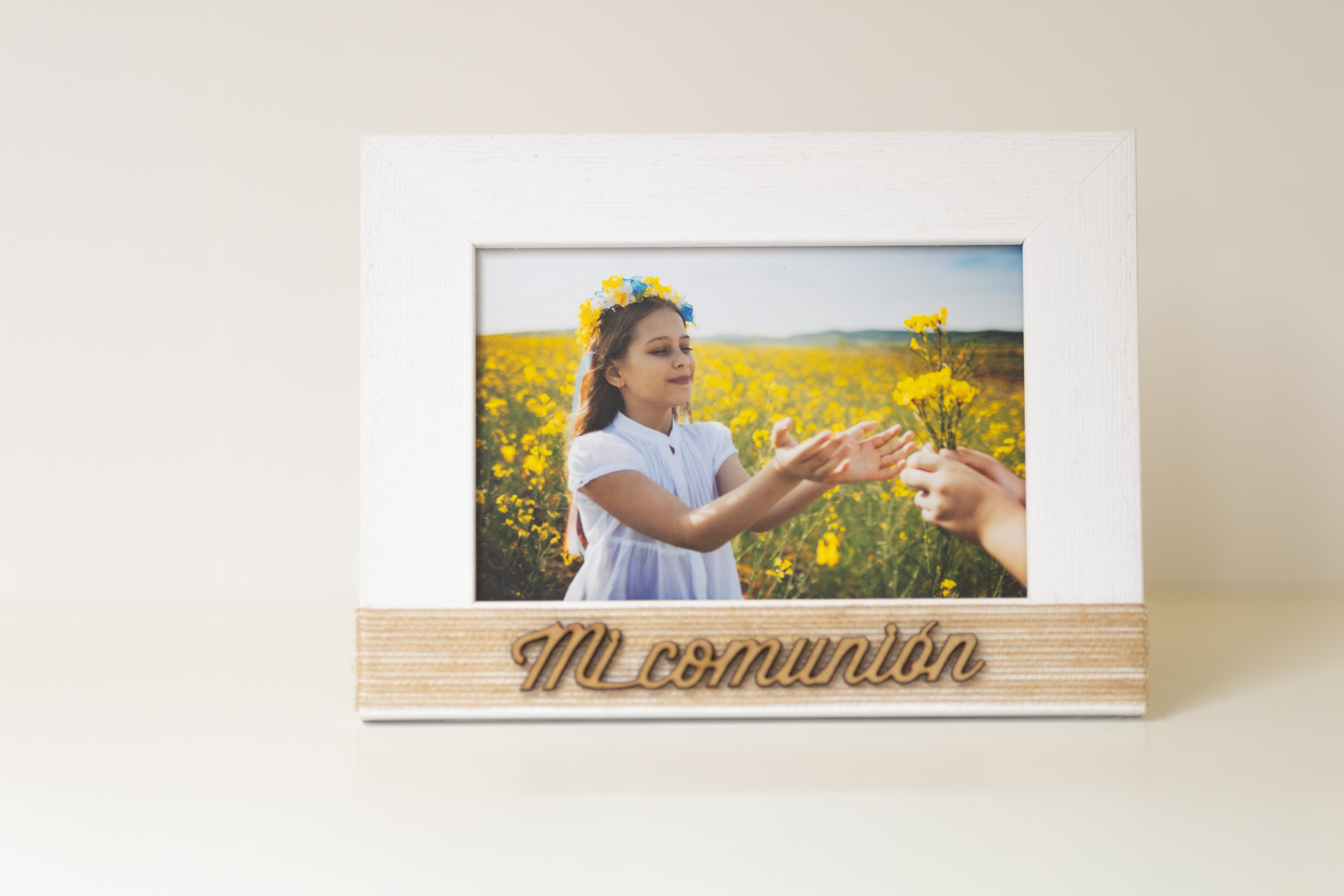 Espacio para una fotografía de 10×15 cm, el formato clásico y perfecto para el retrato oficial de la Primera Comunión.
