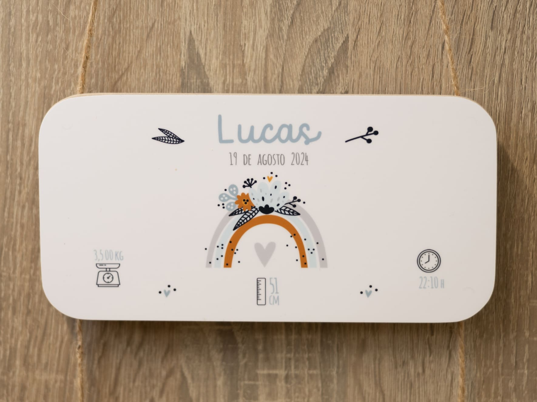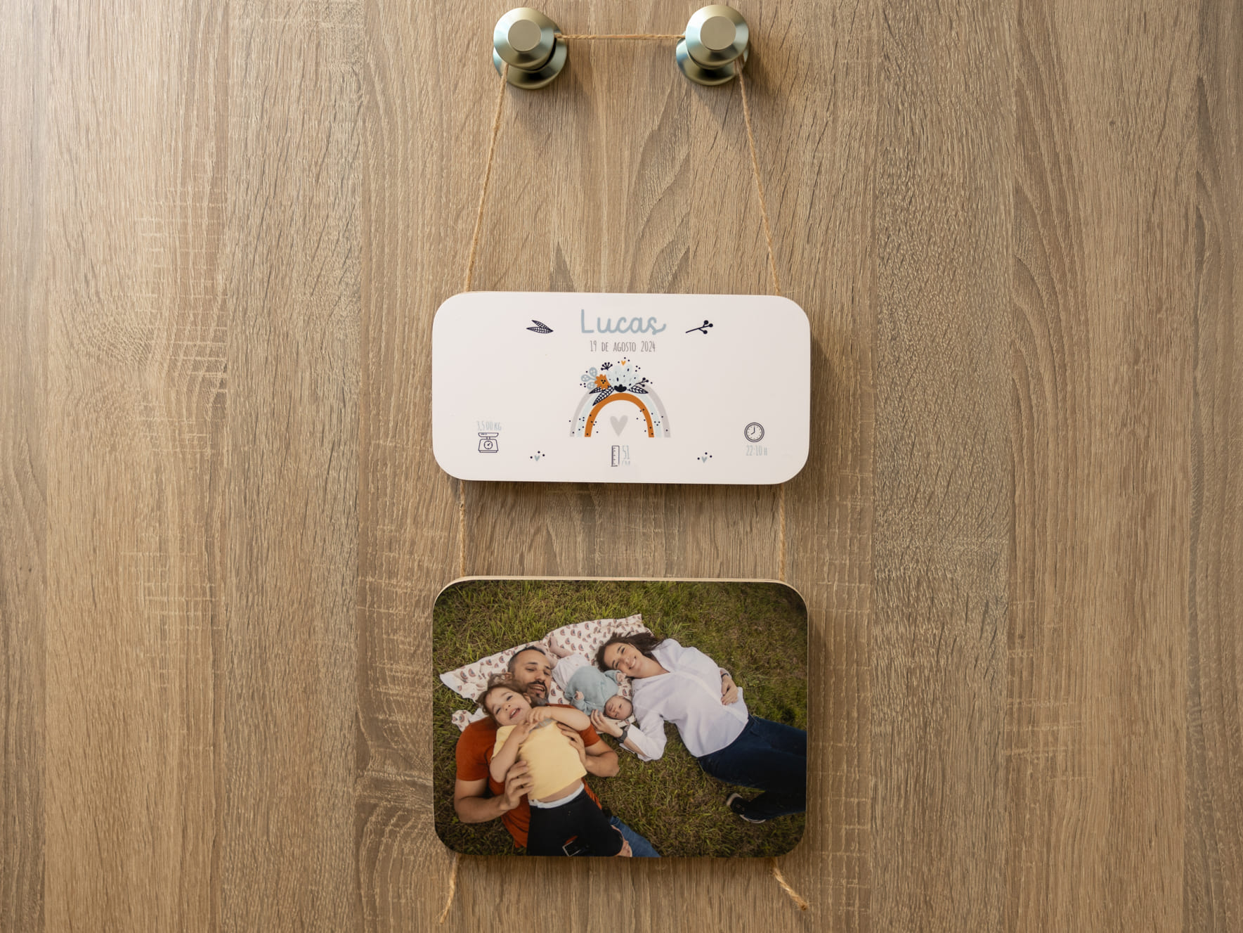 Esta preciosa composición de natalicios en PVC incluye dos placas de 5 mm de grosor, unidas mediante una cuerda decorativa para un toque artesanal y acogedor. El primero de los PVC lleva la descripción del nacimiento, destacando los detalles más importantes de ese momento especial. Con un tamaño de 15×20 cm y un elegante acabado mate, esta pieza es ideal para decorar la habitación del bebé o regalar a los seres queridos como recuerdo único y entrañable.