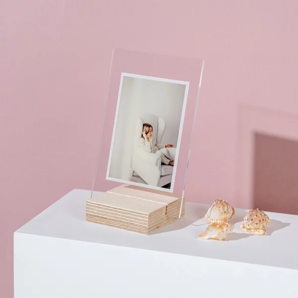 El StandUP Clear es un marco acrílico personalizado con base de madera que combina elegancia y sencillez. Fabricado con acrílico transparente de 3 mm y una base de madera natural, este soporte aporta un toque rústico pero moderno, integrándose a la perfección en cualquier ambiente, desde espacios minimalistas hasta decoraciones más cálidas.